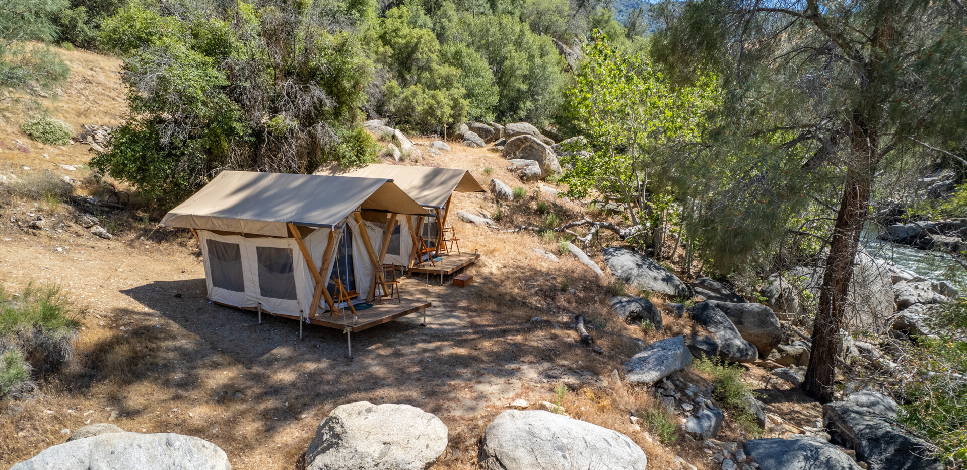 It is a two-day rafting and glamping trip on California’s Lower Kern River, about three hours from Los Angeles. You raft through a scenic granite canyon by day and spend the night at a safari-style riverside camp tucked among oaks and large granite boulders.